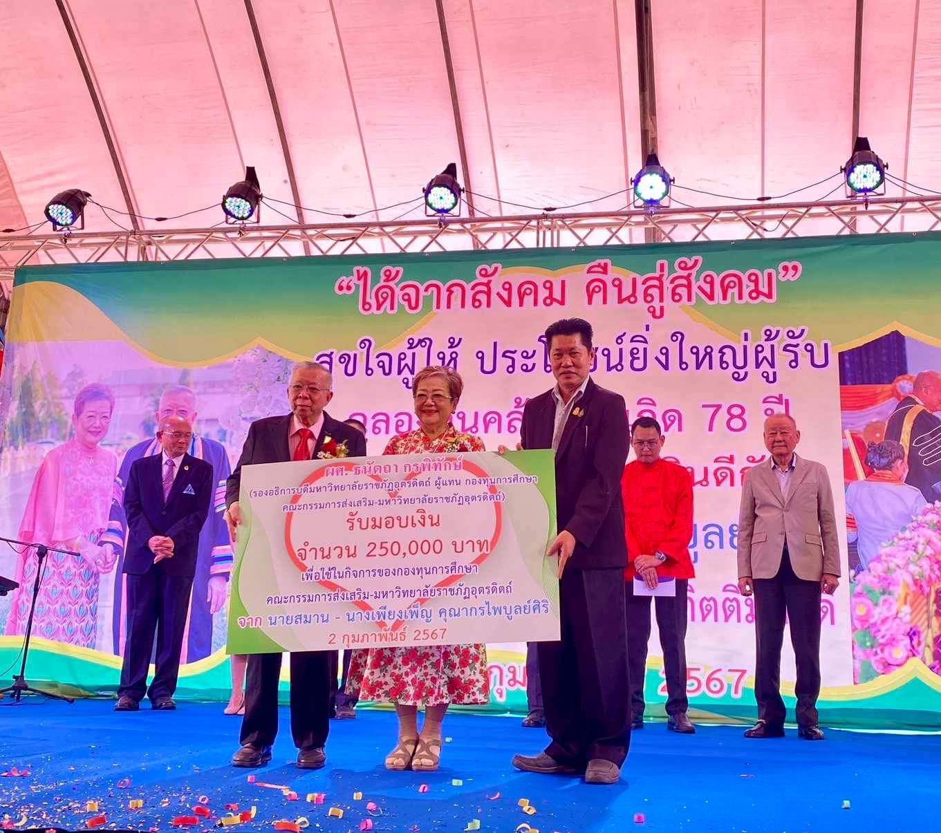 2 กุมภาพันธ์ 2567 รศ.ดร.สุภาวิณี สัตยาภรณ์ อธิการบดี มอบหมายให้ ผศ.ธนัตถา กรพิทักษ์ รองอธิการบดีและ อ.ภูดิท เรืองรอง คณบดีวิทยาลัยน่าน เป็นผู้แทนในการรับมอบทุนการศึกษาจากคุณสมาน คุณากรไพบูลย์ศิริ ประธานคณะกรรมการส่งเสริมกิจการมหาวิทยาลัยราชภัฏอุตรดิตถ์/กรรมการผู้จัดการ บริษัท เกรียงถาวร คอนเทนเนอร์ จำกัด เนื่องในโอกาสวันคล้ายวันเกิด 2 กุมภาพันธ์ 2567 โดยมอบทุนจำนวน 250,000 บาท เพื่อใช้ในกองทุนการศึกษาคณะกรรมการส่งเสริมมหาวิทยาลัยราชภัฏอุตรดิตถ์ และมอบทุนจำนวน 252,000 บาท ให้กับนักศึกษาของมูลนิธิพิพัฒน์แม่ฮ่องสอนที่ศึกษาอยู่ที่วิทยาลัยน่าน