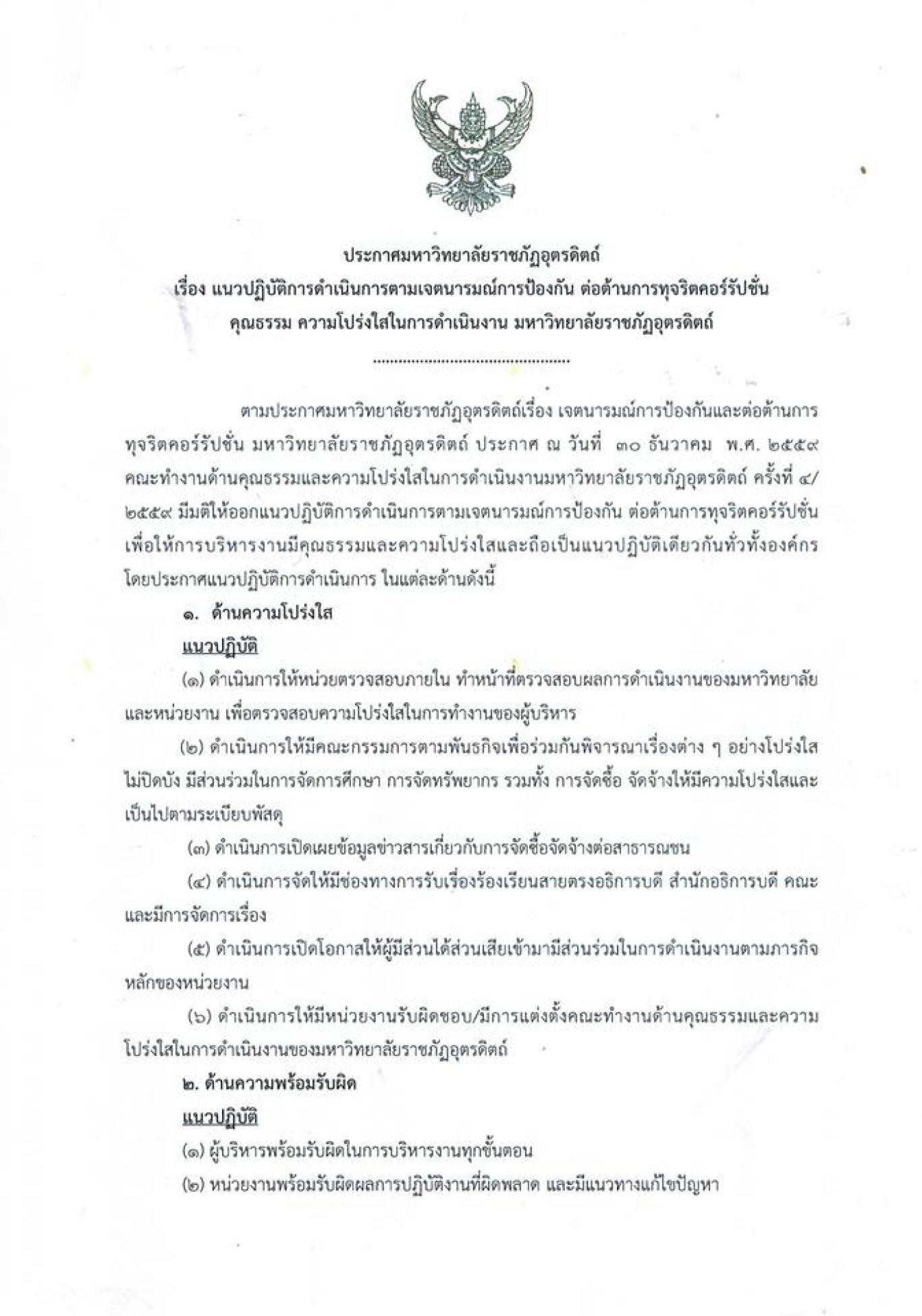 ประกาศ : แนวปฏิบัติการดำเนินการตามเจตนารมณ์การป้องกันและต่อต้านการทุจริตคอร์รัปชั่น มหาวิทยาลัยราชภัฏอุตรดิตถ์